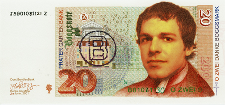 Während einer einmonatigen Performance kreiert der Künstler seine eigenen DEUTSCHEN (BOGGS) MARKS und gibt sie in der Stadt aus. Die Frage, ob er gefälschtes Geld oder wertvolle Kunst aushändigt, ist dem Empfänger überlassen. Die Quittungen und das Wechselgeld in DM werden in der Galerie ausgestellt und können gekauft werden. |